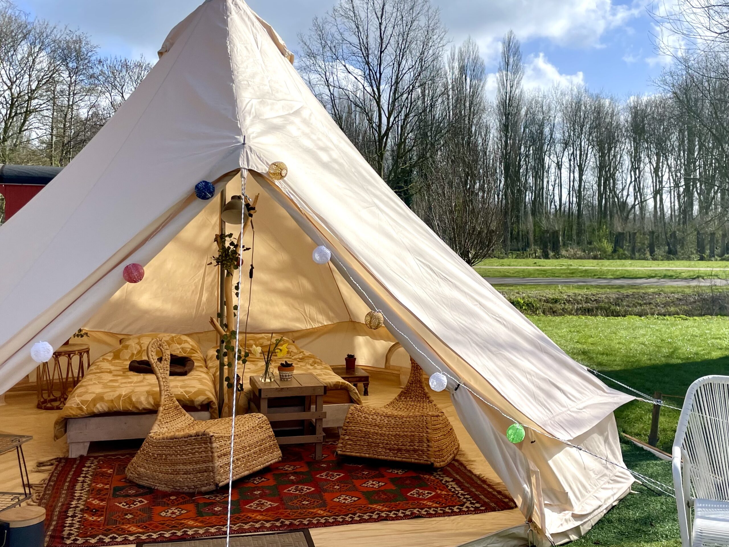 Kampeergemak in een ruime tent: hippe ingerichte Bell tent voor 4 personen.